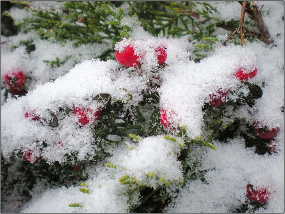 Co ten tis,mimo sníh tam jsou vidět nějaké lístky a výhonky mechu nebo něco podobného,muselo by to ležet na zemi a není vidět ani jeden plod celý.