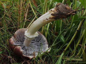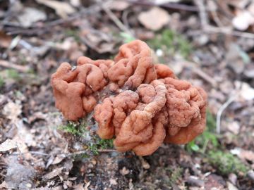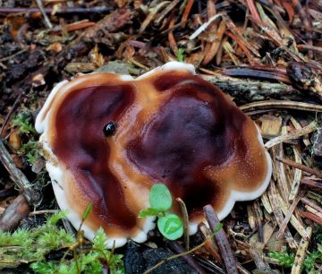 "Na obrázku jsou zobrazeny tři plodnice houby, pravděpodobně Lactarius obscuratus (ryzec olšový). Jedna plodnice je zobrazena shora, s hnědooranžovým, mírně zvlněným kloboukem. Dvě další plodnice jsou otočeny spodní stranou nahoru, ukazujíc husté, krémové až světle okrové lupeny sbíhající na tenký, válcovitý hnědavý třeň. Kolem hub je vidět spadané listí a drobné větvičky, což naznačuje, že rostou v lesním prostředí."