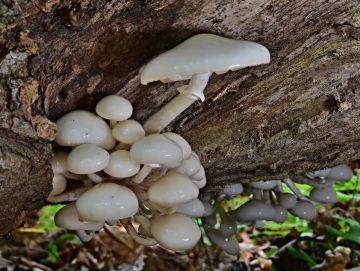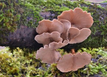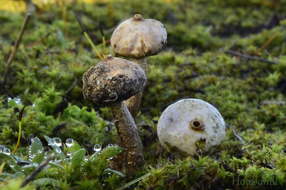 Hlíva číškovitá (Tectella patellaris), zavadající kmínky lísek. Neobvykle rozvité plodničky. ČS - kat. - VU.