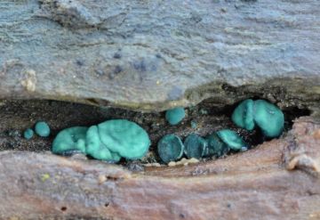 Zelenitka měděnková (Chlorociboria aeruginascens),starší březové zlomy, trvale ovlivňované vodou.