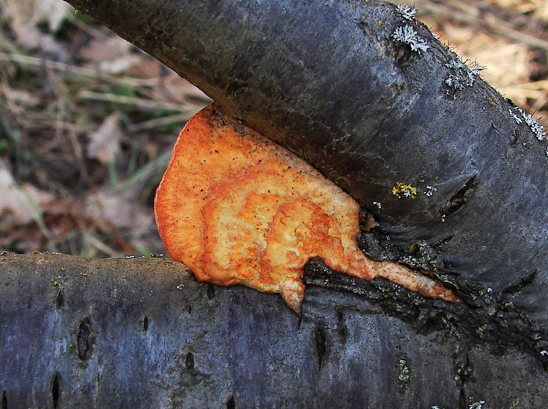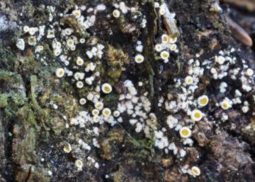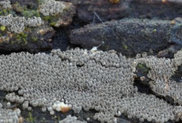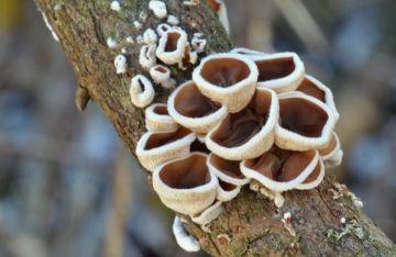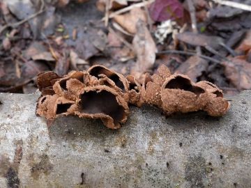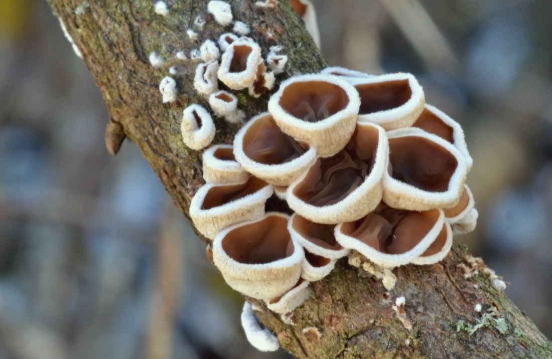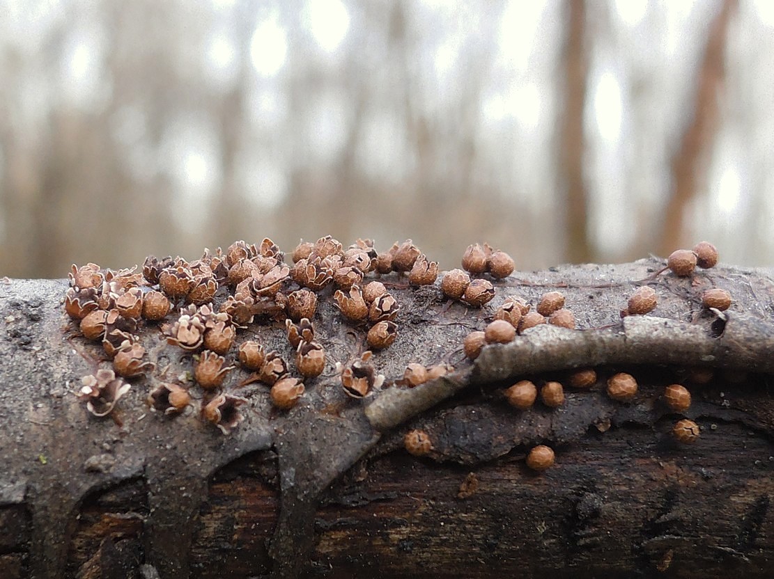 Kornice otrubičnatá (Encoelia furfuracea), odumírající dřevo lísek.
