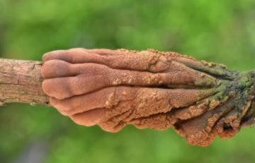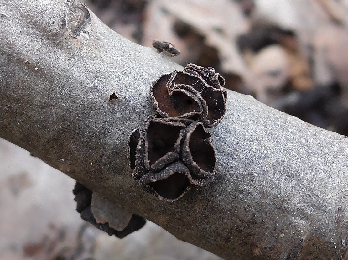 Mušlovka plstnatá (Auriculariopsis ampla), schnoucí větve listnáčů, osiky.