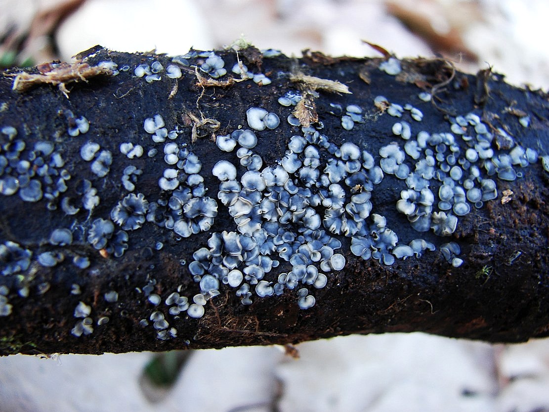 Ušíčko dřevní (Pseudoplectania lignicola), růst na starším dřevitém odpadu jehličatých dřevin, smrk. ČS - kat. - DD.