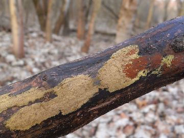Masenka lišejníková (Hypocreopsis lichenoides), odumírající větévky vrby jívy.