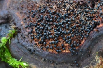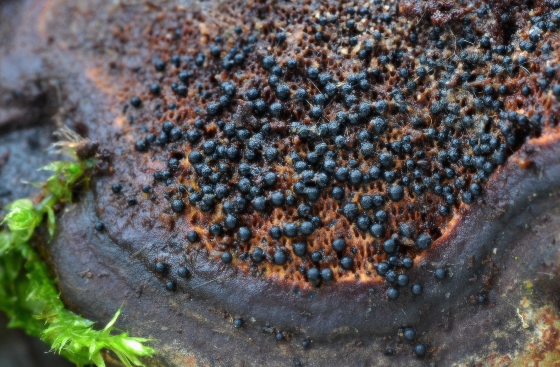 Albertinie chorošová (Albertiniella poriporicola), růst na starší plodnici lesklokorky ploské (Ganoderma lipsiense)