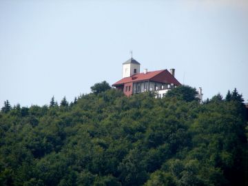 Kostel na snímku je původně katolická zámecká kaple Povýšení sv. Kříže, založená majitelem teplického panství Volfem z Vřesovic, sloužící pravoslavné církvi. Na stavbu věže byly použity kameny z románské baziliky benediktinského kláštera sv. Jana Křtitele. Pod kostelem se nachází hrobka pánů z Vřesovic. Po levé straně mimo snímek (na konci onoho ve spodní části viditelného zábradlí) se nachází děkanský kostel sv. Jana Křtitele, pod nímž se nacházejí hrobky rodů Vchynských a Clary-Aldringenů (poslední majitel panství z rodu Vchynských byl zavražděn v Chebu společně s Albrechtem z Valdštejna). Samotný klášter založený královnou Juditou už v Teplicích jako takový nenajdete, ten zanikl již během husitských válek a jeho budovy využil k přestavbě na své sídlo husitský hejtman Jakoubek z Vřesovic. Dnes lze části jeho budov vidět zakomponované do jižního křídla zámku.