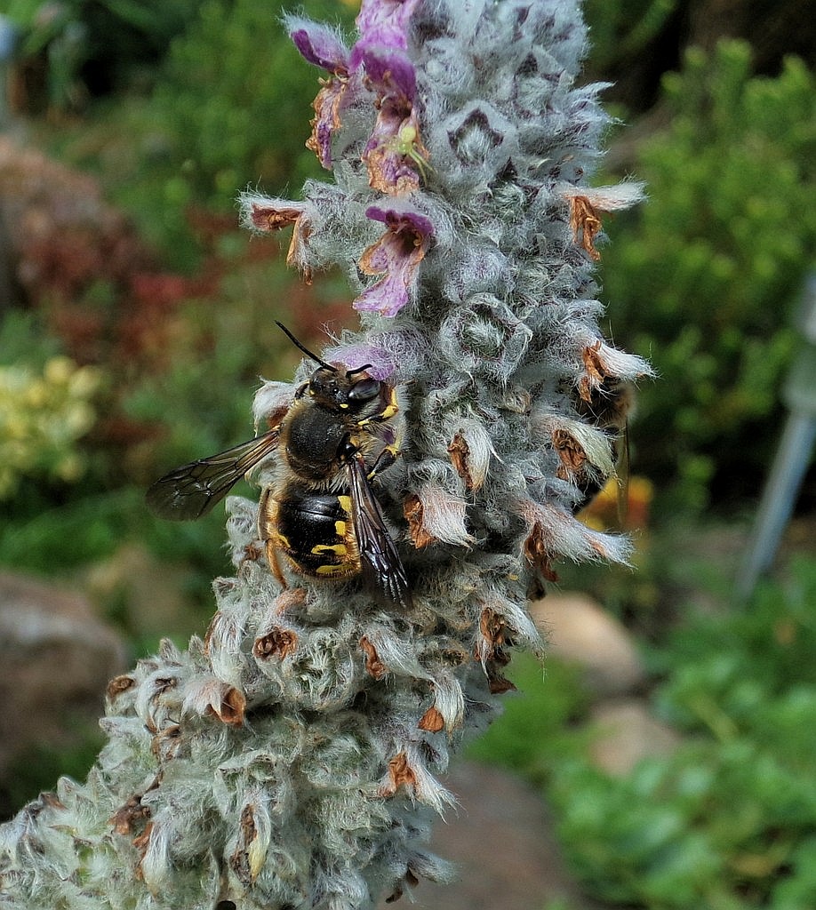 Na nejhořejší fotografii je hnízdní parazit pelonosek, smutilka. Asi obecná, ale je jich víc podobných druhů. Jedinec na fotce je dost kontrastní, může to být sameček smutilky obecné, ti jsou vždycky víc vyfešákovaní, a nebo to může být smutilka Melecta luctuosa, ta je vzácnější a nemá české jméno, a taky parazituje u pelonosek.