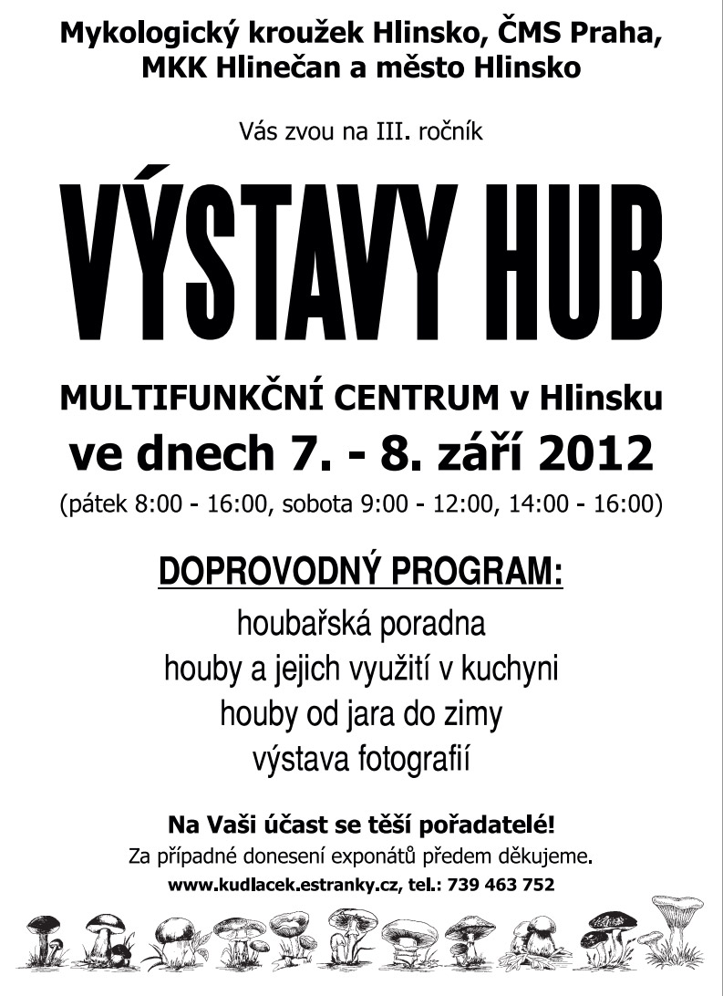 Stává se pravidlem, že během zářijových dnů se v Hlinsku koná originální výstava věnovaná houbám. První dva ročníky této výstavy proběhly v prostorách Městského muzea, letošní ročník najde své umístění v prostorách hlineckého Multifunkčního centra a to ve dnech 7. a 8. září.