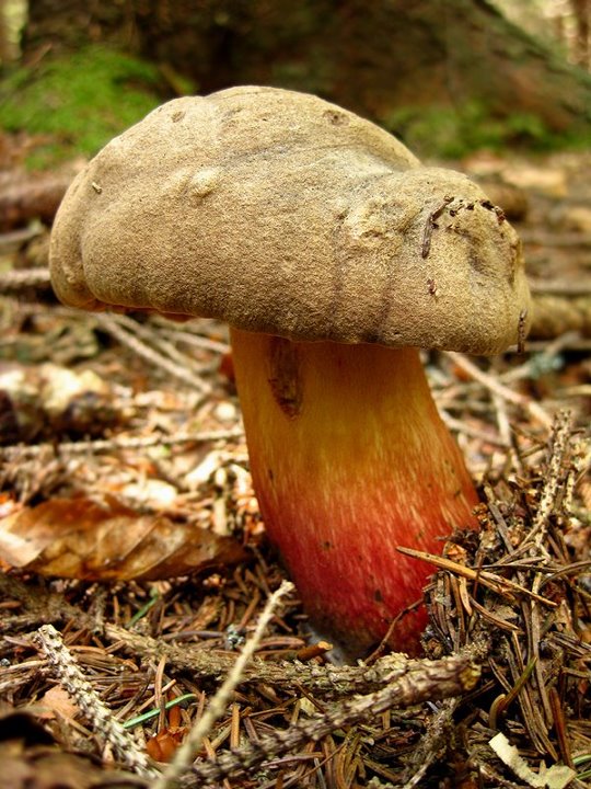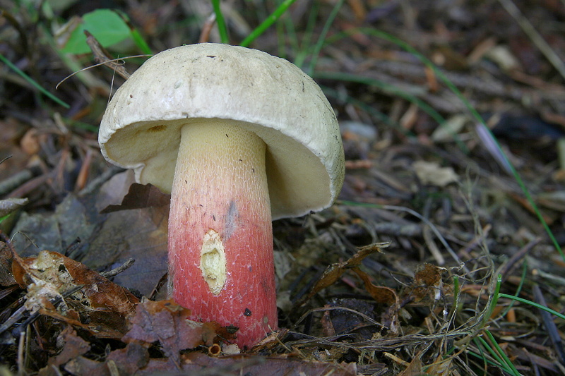 Bledě hnědý klobouk, žluté póry, horní polovina třeně žlutá, dolní polovina červená třeně, se síťkou.