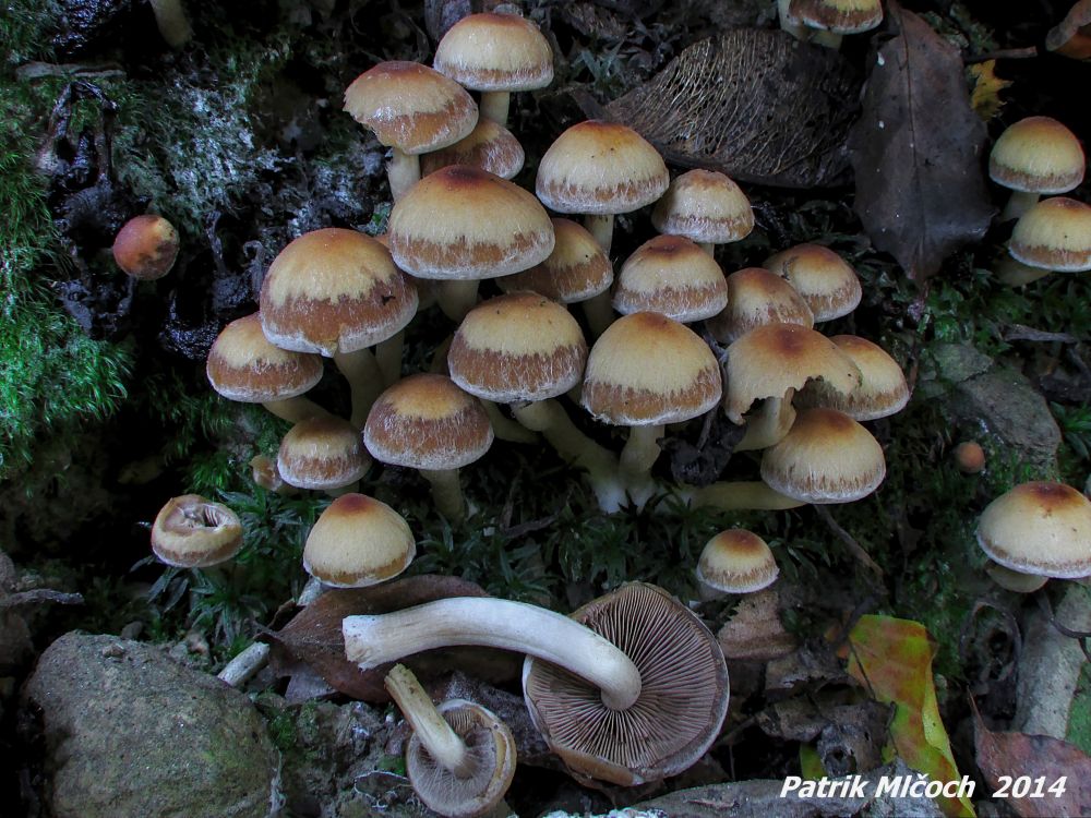 Křehká dužnina, růst v bohatých trsech a za sucha do žlutookrova vybledající klobouk.