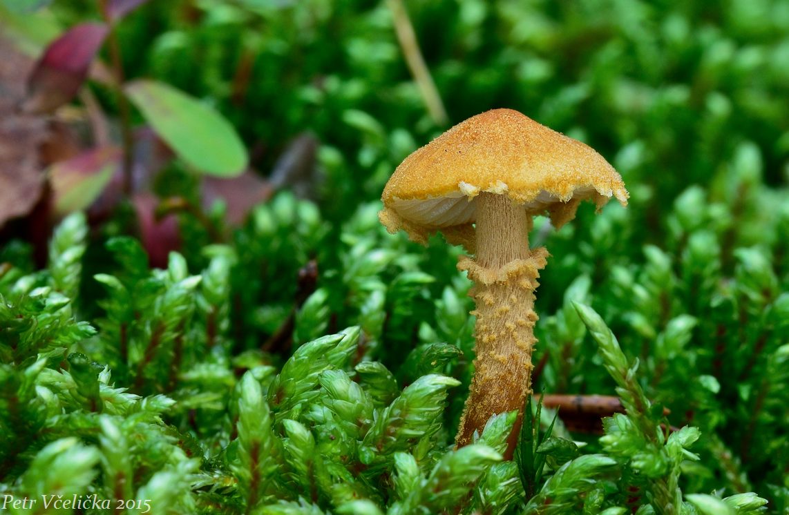 Klobouk 20 - 50 mm, kuželovitý pak vyklenutý, s hrbolkem, v mládí na okraji se zbytky vela, zrnitý, žlutookrový, žlutohnědý až žlutooranžový. Lupeny vykrojené a úzce připojené, bělavé až nažloutlé. Třeň 25 - 60 x 2 - 7 mm, válcovitý, na vrcholu krémový a vločkatý, pod prstenem okrově až oranžově hnědě šupinkatý, pomíjivý. Dužnina bělavá až oranžově žlutá, s nepříjemným pachem a nevýraznou chutí.