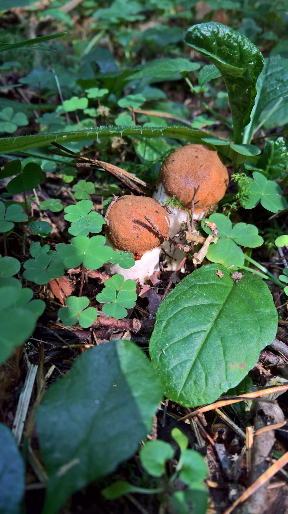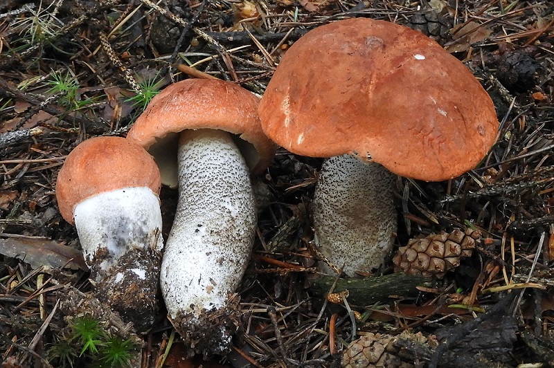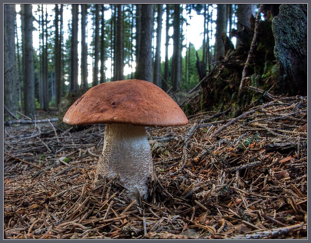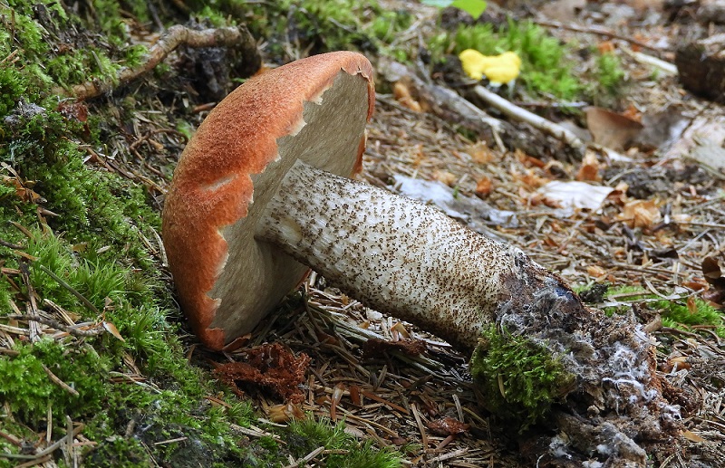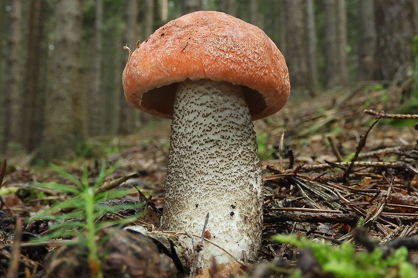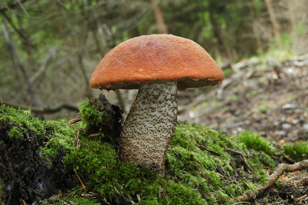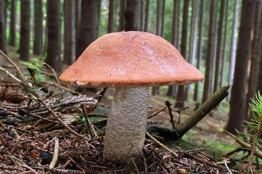 Smrkový biotop, tmavě červený klobouk, přetažená pokožka klobouku, tmavé póry a šupiny na třeni, barevné reakce dužniny.