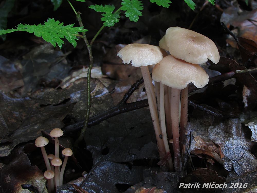 Roste obvykle trsnatě, světle hnědé až žlutohnědé kloboučky, tenký dlouhý třeň.