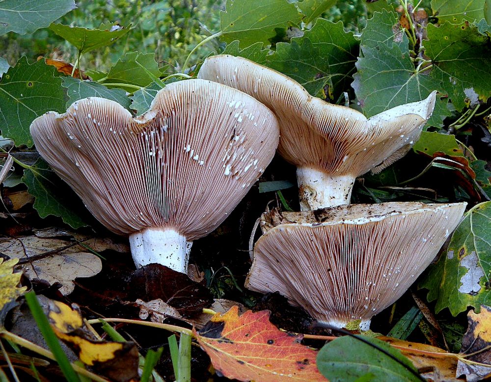 Lupeny jsou sbíhavé, krémové, později špinavě růžové.
