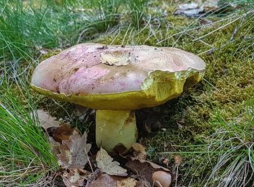 Dospělý prosvětlený bor. Hřib strakoš (Suillus variegatus). Zde slimáci řádili, většina nalezených plodnic sežraná.