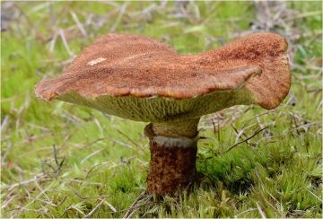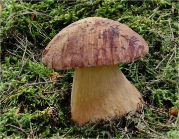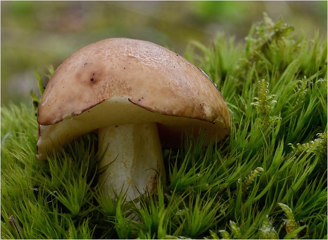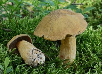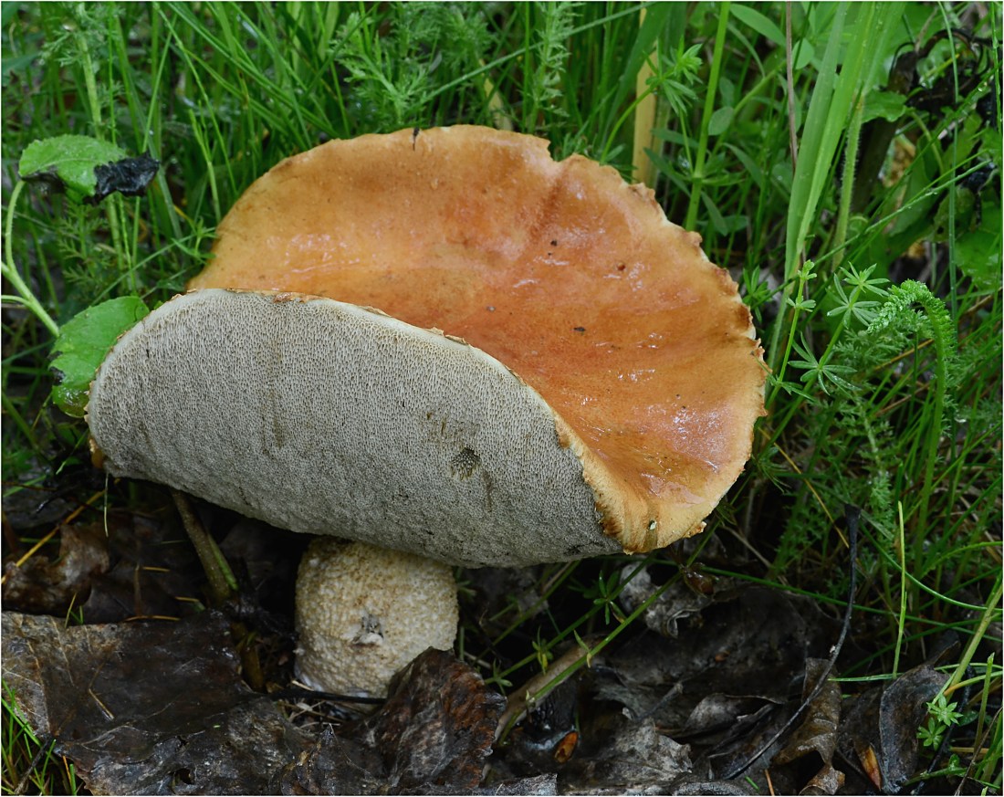 Stejná lokalita, pod modříny. Hřib dutonohý (Boletus cavipes)