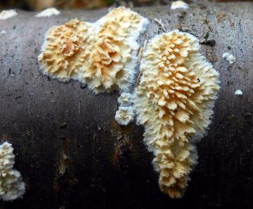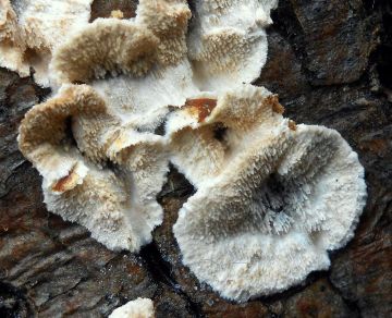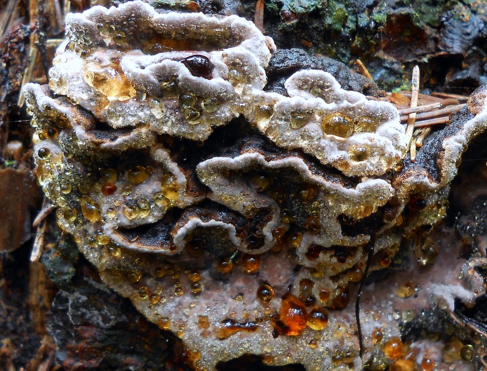1. Pevníkovec ztlustlý (Amylostereum areolatum) - Gutující plodnice. Smolokorka pryskyřičnatá by měla rourkatý hymenofor.