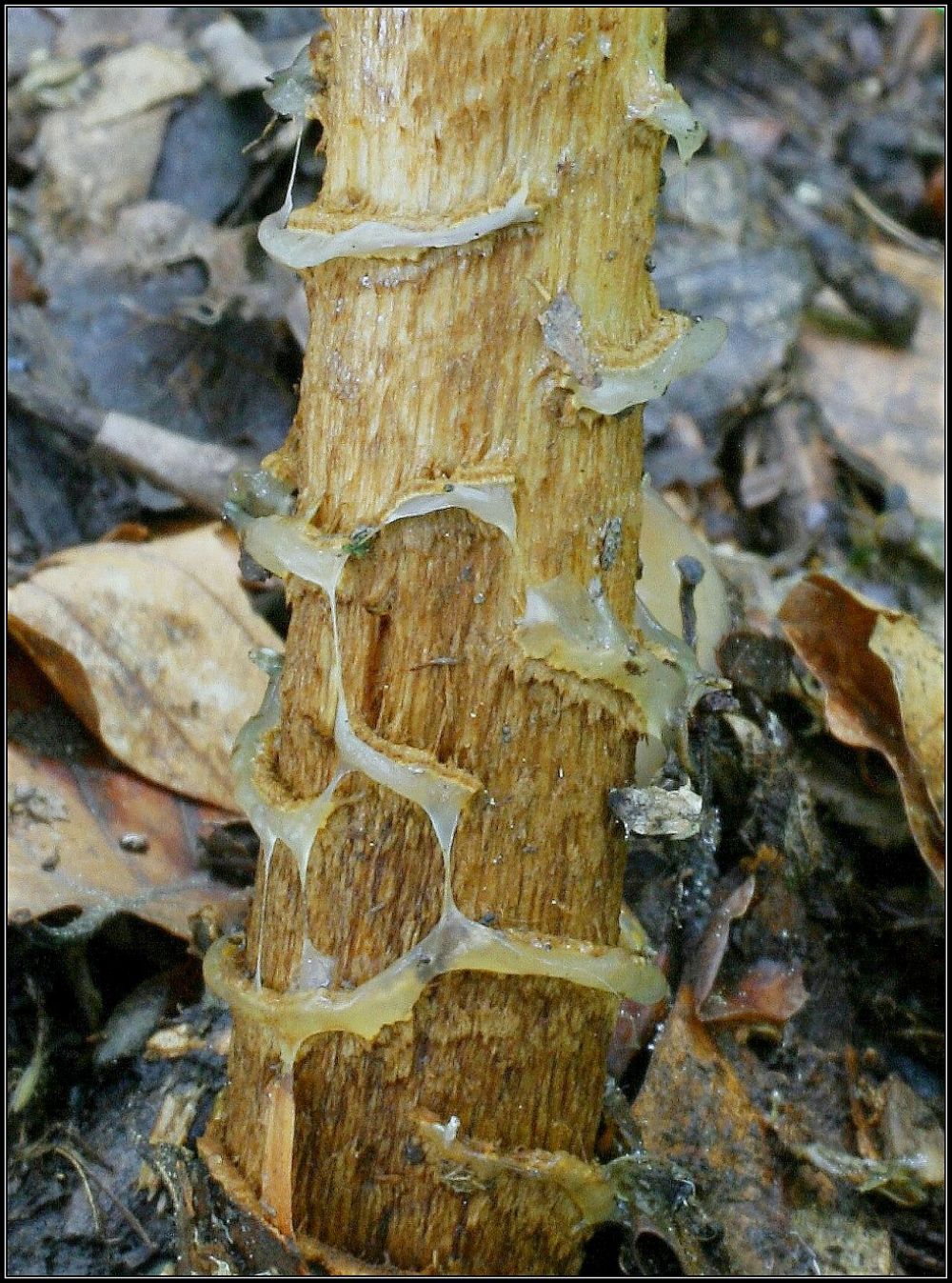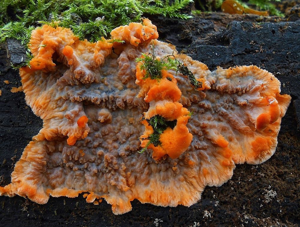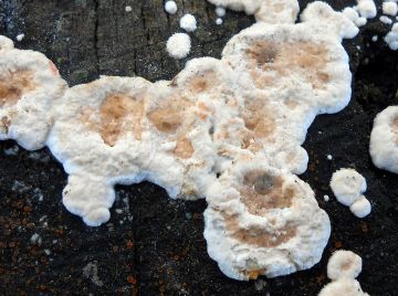 3. Pevník korkovitý (Stereum rugosum) - Důležité je u něj červenání po otlačení. Bylo by moc jednoduché, kdybych dal do kvízu plodnice, na nichž je to krvavění patrné, ale při troše pozornosti bylo možné si na fotce místy všimnout náznaků červenání.