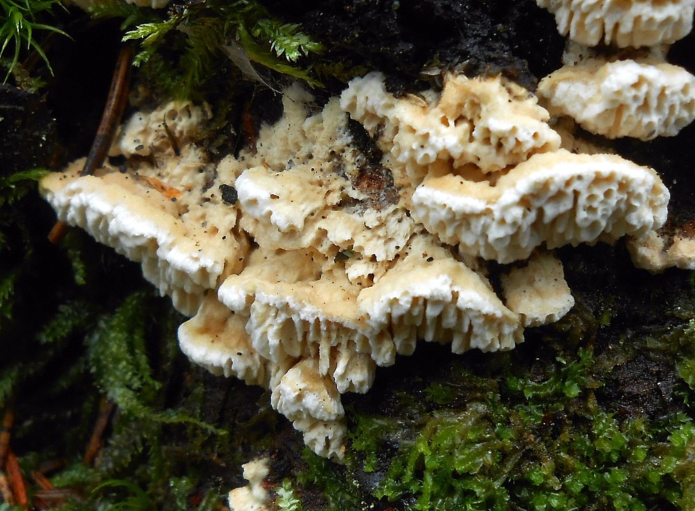 2. Outkovka různotvará (Antrodia heteromorpha) - Též houba ze semináře, kde jsem ji viděl poprvé. Nacházel jsem ji tam na nejednom smrkovém pařezu.