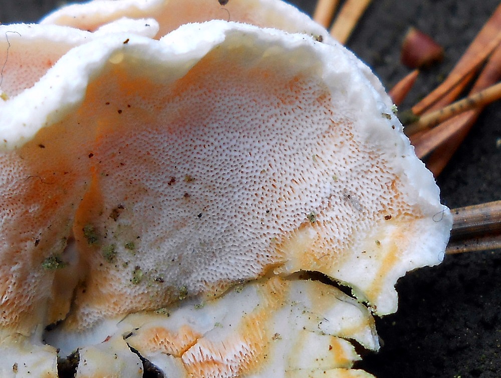 4. Kostrovka beztvará (Skeletocutis amorpha) - Nepříliš běžný druh rostoucí na mrtvém dřevě jehličnanů. Nápadná kombinací bělavého klobouku a oranžových, místy i narůžovělých pórů.