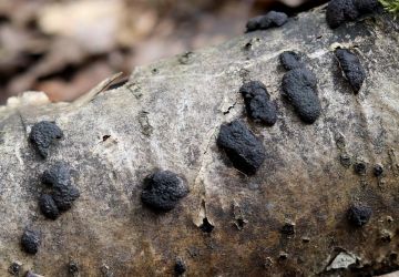 Tlející větve borovic, snad kropilka stopkatá (Dacrymyces capitatus)