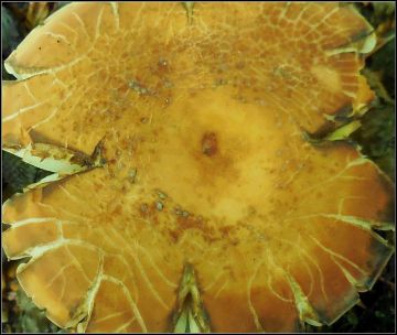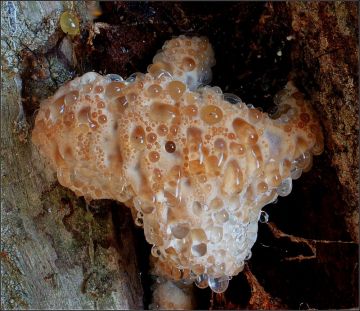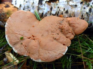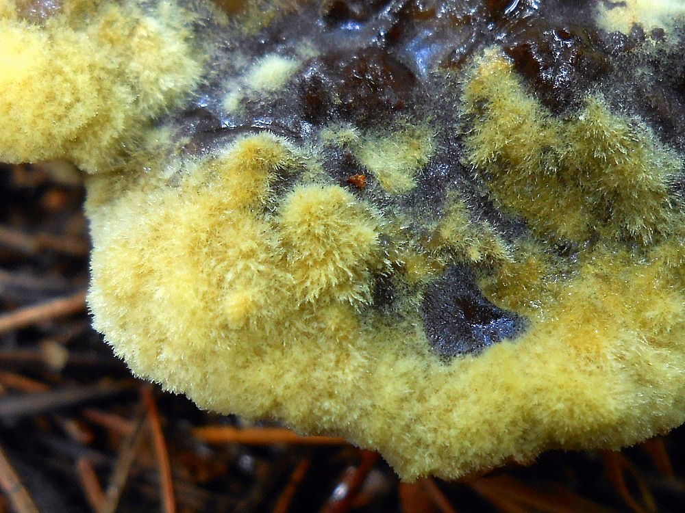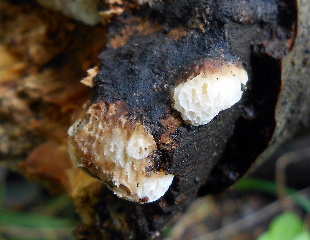 3. Outkovka polní (Dichomitus campestris) - Našel jsem ji minulé pondělí. Je to poměrně vzácná chorošovitá houba rostoucí na dřevě listnáčů, nejčastěji lísek. Význačná tím, že její plodnice od místa připojení k substrátu často černají. Barvu rourek může mít v závislosti na věku různou - nejdříve bělavě nažloutlou, béžovou, naoranžovělou, červenavou, rezavou až černou. Zařazena v Červeném seznamu v kategorii NT (téměř ohrožený druh).