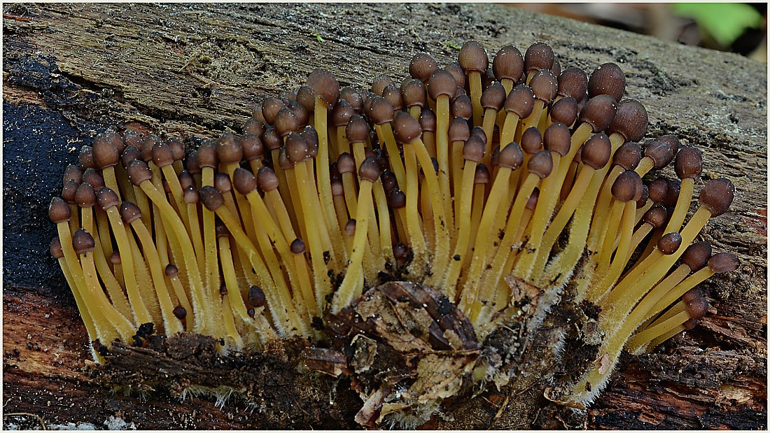 Helmovka žlutonohá (Mycena renati), společné foto, připomínající tablo, absolventů středních škol.