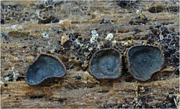 Ušíčko dřevní (Pseudoplectania lignicola), růst na rozkládajícím se dřevěném odpadu jehličnanů.