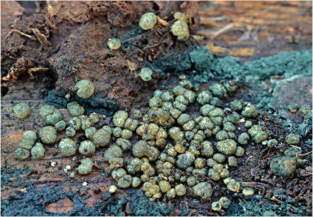 Ploskovička olivová (Catinella olivacea), silně rozložené dřevo buku, plodnice drží tvar ale jsou vyšisované po zimním počasí. ČS - kat. NT - téměř ohrožený druh.