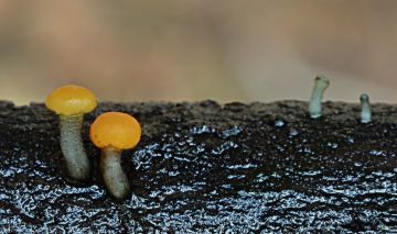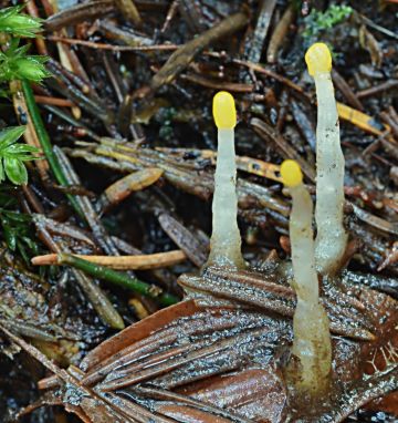 Čapulka bahenní (Mitrula paludosa), trvale vlhké prameniště, smrčina.