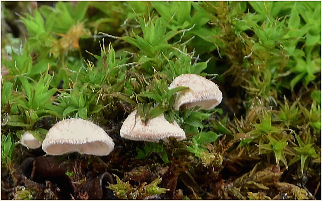Mecháček síťnatý (Arrhenia retiruga), na různých druzích mechorostů.