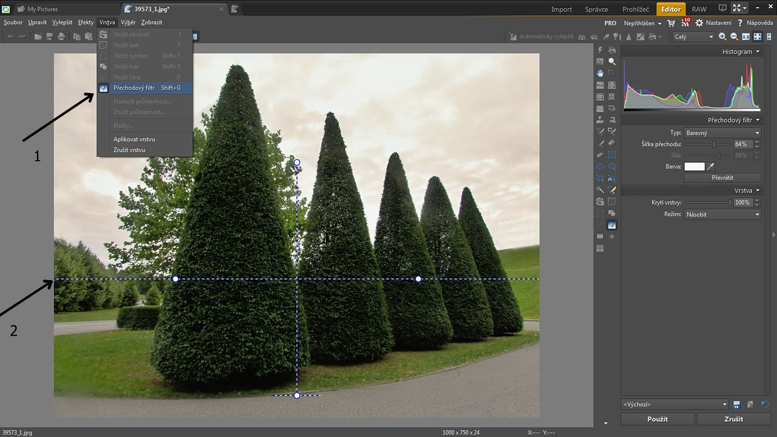 - v menu Vrstva vyberu Přechodový filtr - šipka 1