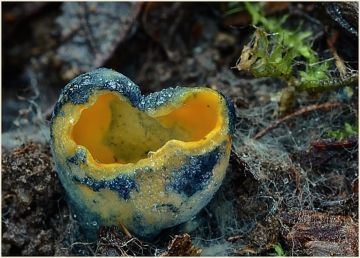 Krasočíška žlutá (Caloscypha fulgens), smíšený listnatý les , asi bude rok jejího růstu.