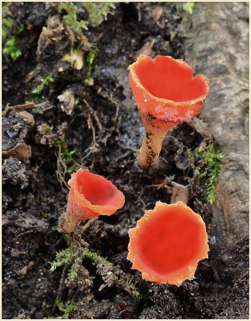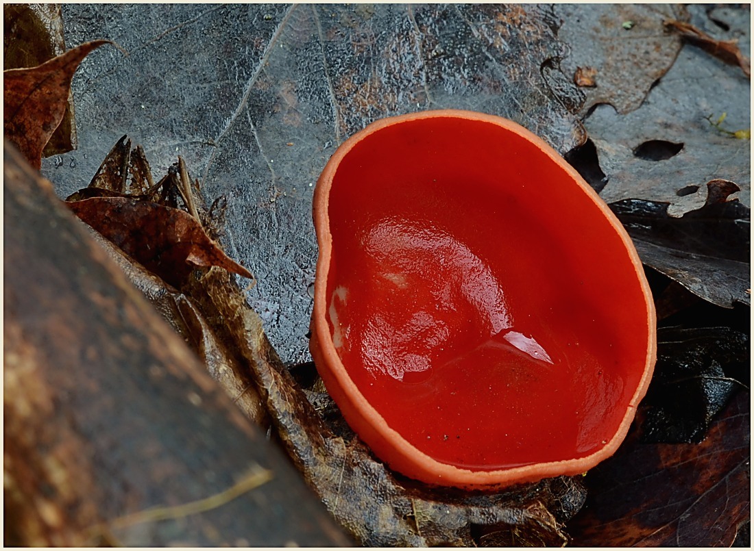 Ohnivec rakouský (Sarcoscypha austriaca), pod vrbami vyrostl do krásy.