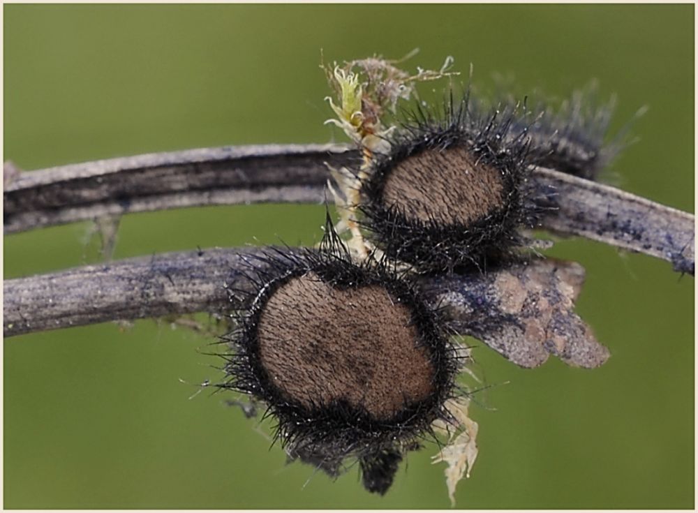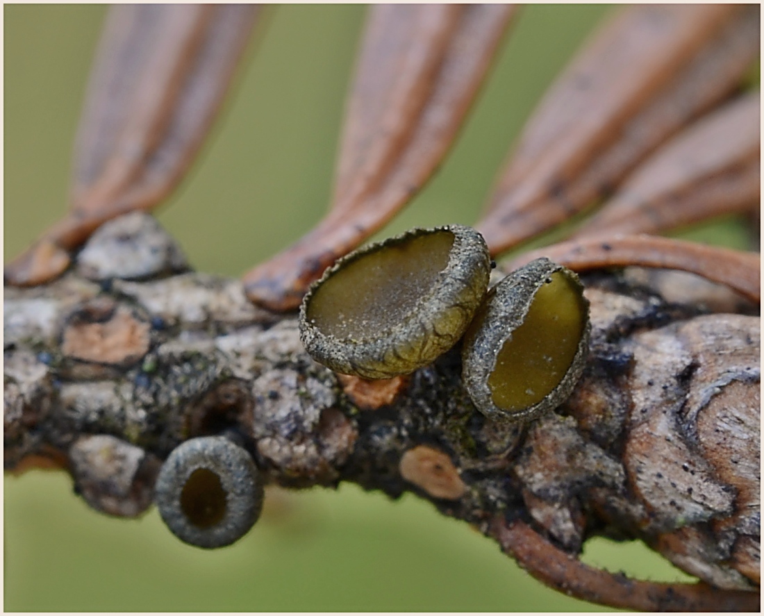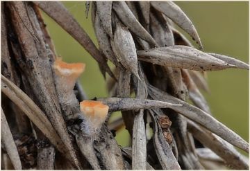 Hromada ořezaných větví z jalovce. Drobná, pohledná houbička, džbánovka jalovcová (Pithya copressima), v hojném počtu na nich rostoucí.