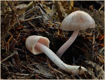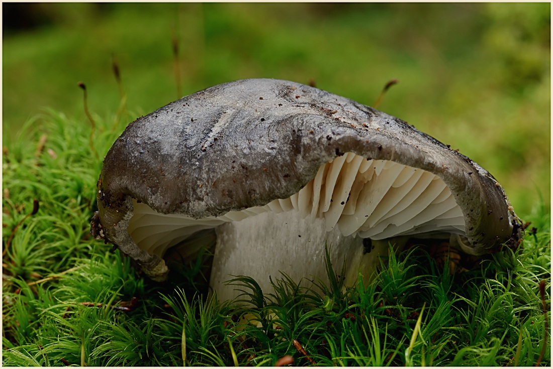 Středně stará, mechatá, smrčina s vtroušenou břízou. Šťavnatka březnovka (Hygrophorus marcuolus)