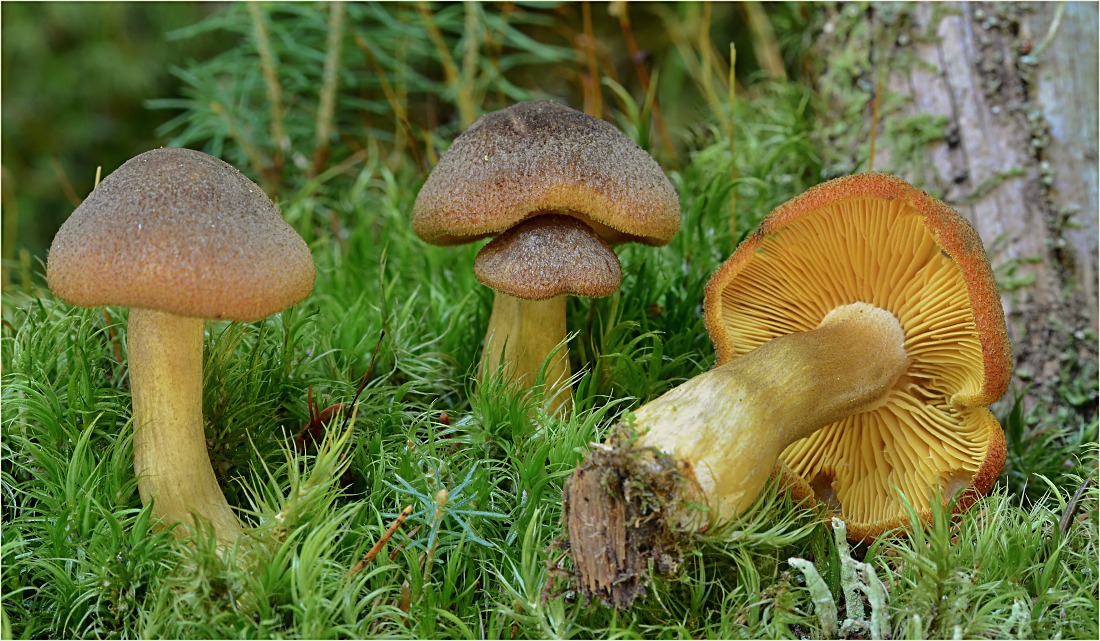 Podhorská rašelinná smrčina, na starších vývratech, porostlých mechem, růst šafránky ozdobné (Tricholomopsis decora)