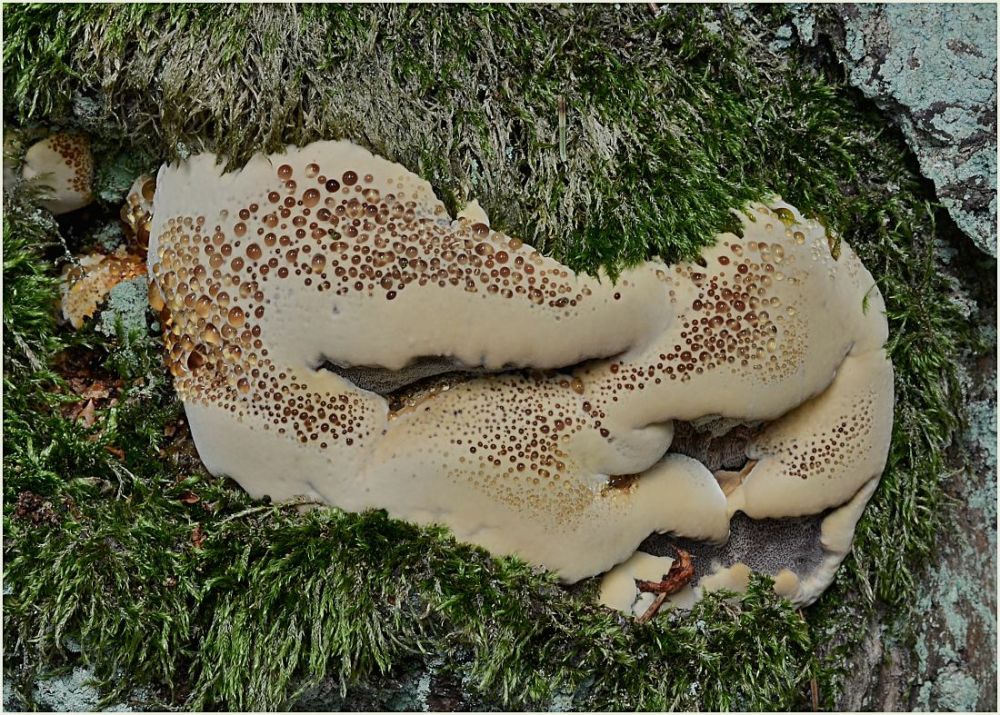 Rezavec lesknavý (Xanthoporia radiata), růst na olši, za pozornost stojí jeho decentní gutace.