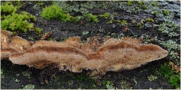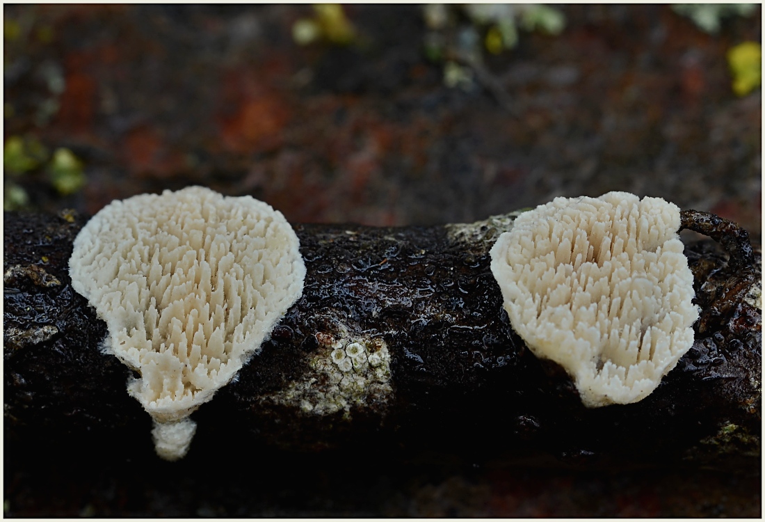Bránovitka přezkatá (Steccherinum oreophilum), na schnoucích větvičkách osik. Vzácný výskyt růstu.