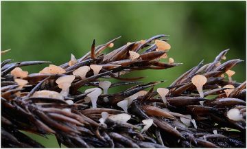 Džbánovka (Pithya cupressina), růst na ořezaných jalovcových větvích, vyvezených ze záhrádek na lesní skládku.