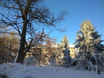Zasněžené smrky ztepilé(Picea abies) a dub(Quercus sp.) v pozadí se zasněženým domem.