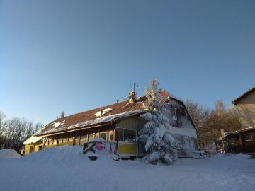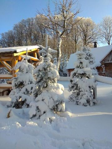 Zasněžená chalupa se smrkem ztepilým (Picea abies) v popředí.