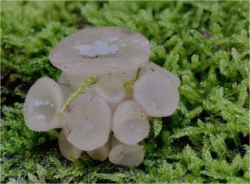 Číšovec perovníkový (Woldmaria filicina), rostoucí na schnoucích částech kapraďorostu perovníku pštrosího.