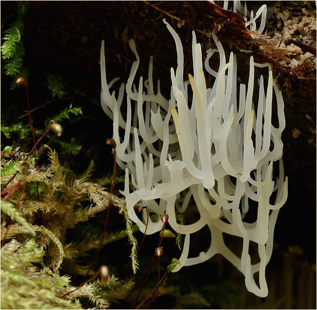 Na některých ležících, hodně rozložených, kmenech buků, růst tužnatky (Lentaria sp.)