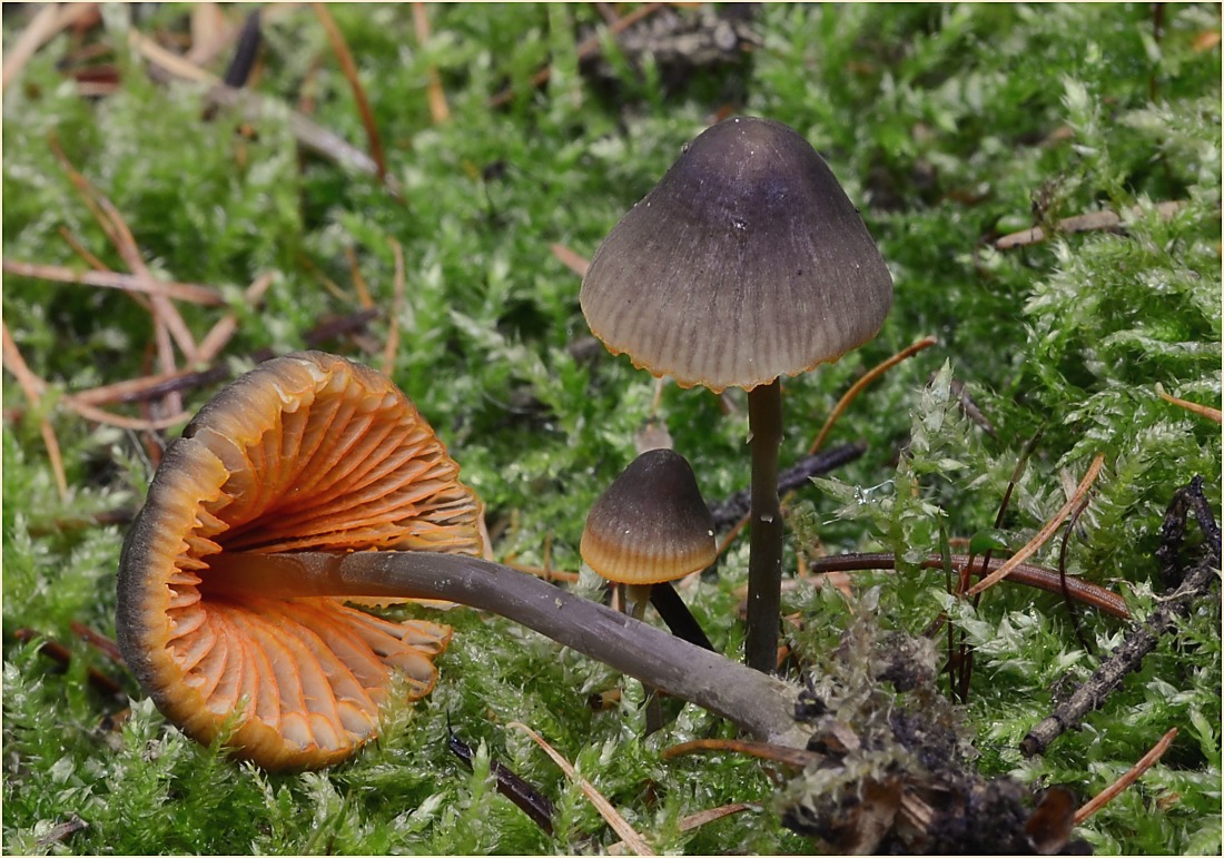 Stejná lokalita, jehličnatý les, helmovka zlatobřitá (Mycena aurantiomarginata).