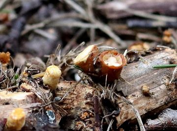 Voskovka krvavá (Hygrocybe miniata), květnatá bučina, pařez listnáče v pokročilém stupni rozkladu.