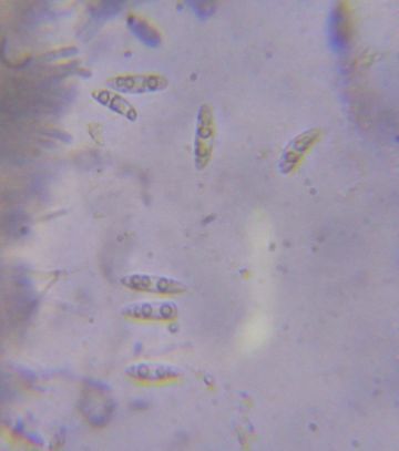 Výtrusy byly elipsoidní, zašpičatělé, naměřil jsem 15-20,5 x 4,5-6,5 μm. Je pravda, že výtrusy voskovičky listomilné jsou trochu menší. Měřením vřecek jsem se příliš nezabýval, ale vím, že jedno mělo cca 80 x 10 μm. Parafýzy nemají nijaké příliš specifické zakončení. Excipulum jsem nemikroskopoval, kdyby bylo pro určení důležité, tak můžu zmikroskopovat opětovně.