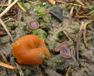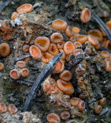 Ne, to oranžové na mykologie.net je spálenitka, ptala jsem se Lucky, když dávala tu fotku na FB. Mohla to, pravda, napsat. Tohle bude asi taky spálenitka, moc jiných oranžových hub okolo 1 cm v průměru na ohništi neroste.