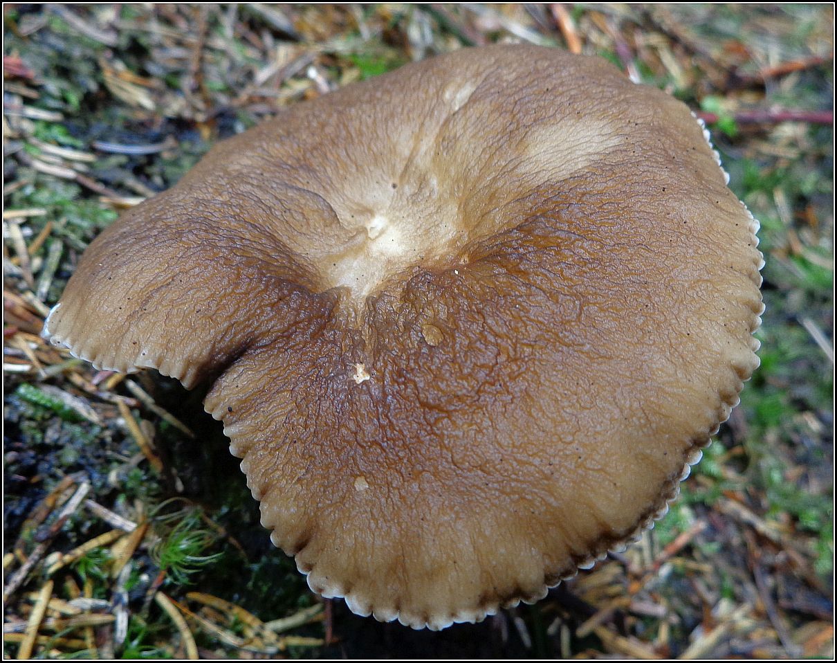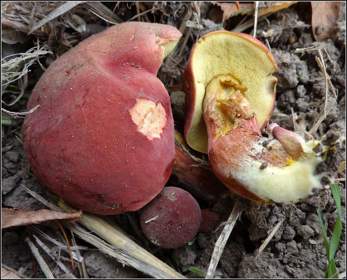Podobné červenofialové nebo vínově červené plodnice s rozpraskaným kloboukem, které potkávám zde u nás - jedna lokalita je pod borovicemi a osikami na místě, které je při standardních srážkových a teplotních poměrech dosti vlhké a zjara hostí početné kolonie čapulek bahenních, druhá lokalita leží na břehu rybníka, kde rostou v trávě vedle rákosového pole pod topoly a vrbami - si označuji jako hřib mokřadní (Xerocomellus ripariellus).