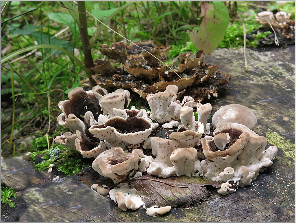 No jestli to vidíš jasně, tak já tedy ne. Trametes versicolor/ochracea podle mne nula bodov. Outkovka pásovaná snad tvoří skloněné klobouky. Outkovka pestrá, tedy Chorchee promiň, je ale snad čirá fantázia.